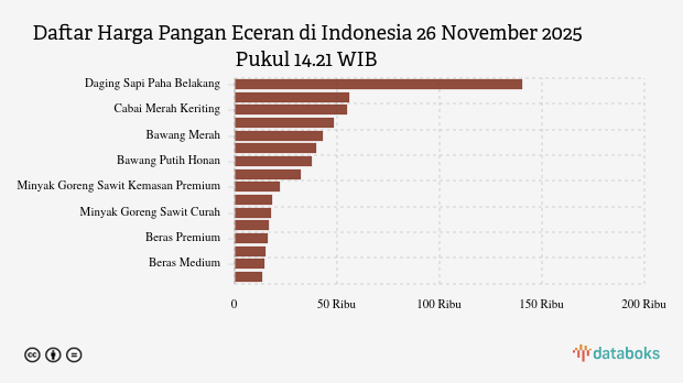 Melansir data Sistem Pemantauan Pasar Kebutuhan Pokok Kementerian Perdagangan (SP2KP Kemendag) pada Rabu (26/11/2025) pukul 16.57 WIB, dari 16 komoditas terdapat 4 komoditas naik dan 1 komoditas turun.