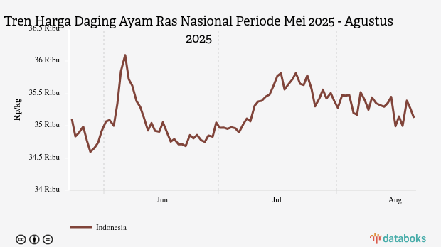 Selama periode Mei 2025 - Agustus 2025, rata-rata harga daging ayam terendah Rp34.597 per kg pada Rabu, 28 Mei 2025. Adapun harga tertinggi mencapai Rp36.096 per kg pada Jumat, 6 Juni 2025.