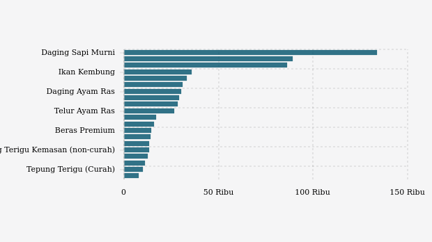 - Daging Sapi Murni: Rp133.620 per kg (turun 0,6%)