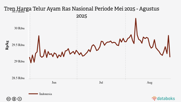 Selama periode Mei 2025 - Agustus 2025, rata-rata harga telur ayam terendah Rp28.973 per kg pada Minggu, 1 Juni 2025. Adapun harga tertinggi mencapai Rp30.309 per kg pada Kamis, 7 Agustus 2025.