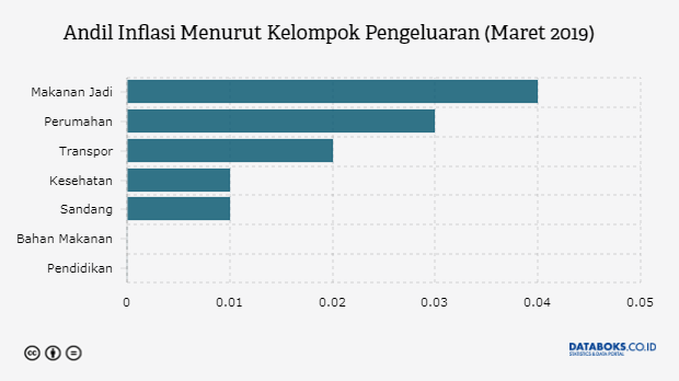 Kelompok pengeluaran makanan jadi, minuman, rokok, dan tembakau memberi andil inflasi terbesar pada Maret 2019, yakni mencapai 0,04%. Kontribusi inflasi terbesar kedua adalah kelompok pengeluaran perumahan, air, listrik, gas dan bahan bakar dengan andil 0,03% seperti terlihat pada grafik di bawah ini.