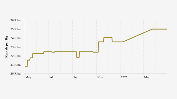 Sedangkan harga gula pasir kualitas premium harian di pasar modern dalam tiga bulan terakhir di Papua Barat telah mengalami kenaikan sebesar 11,36% dari sebelumnya yang tercatat di harga Rp22,45 ribu per kg.