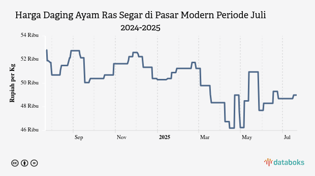 Adapun terhadap harga sebulan terakhir, perkembangan harga daging ayam ras segar harian di pasar modern mengalami kenaikan dari sebelumnya yang tercatat sebesar Rp48,3 ribu per kg.