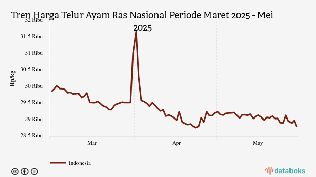 Selama periode Maret 2025 - Mei 2025, rata-rata harga telur ayam terendah Rp28.764 per kg pada Rabu, 23 April 2025. Adapun harga tertinggi mencapai Rp30.242 per kg pada Rabu, 2 April 2025.