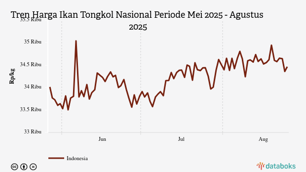 Selama periode Mei 2025 - Agustus 2025, rata-rata harga ikan tongkol terendah Rp33.505 per kg pada Selasa, 3 Juni 2025. Adapun harga tertinggi mencapai Rp35.040 per kg pada Jumat, 6 Juni 2025.