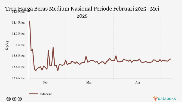Selama periode Februari 2025 - Mei 2025, rata-rata harga beras medium terendah Rp13.573 per kg pada Rabu, 5 Februari 2025. Adapun harga tertinggi mencapai Rp13.811 per kg pada Rabu, 2 April 2025.