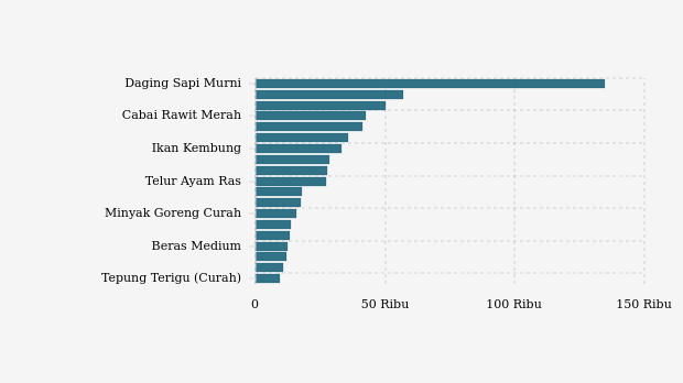 Komoditas bawang merah naik paling tinggi Rp4.590 (10,11%) menjadi Rp50.000 per kg. Adapun harga daging sapi murni turun paling rendah Rp2.070 (1,51%) menjadi Rp134.910 per kg.