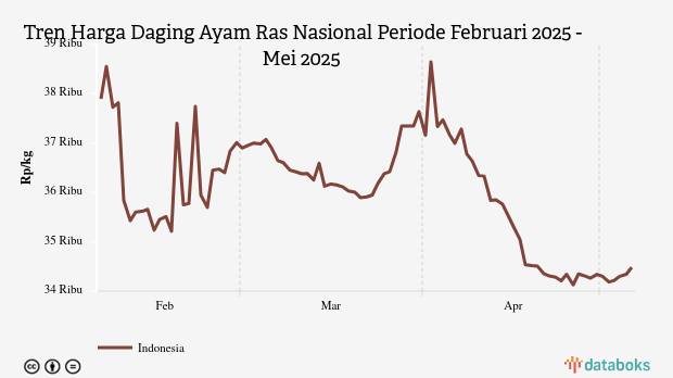 Selama periode Februari 2025 - Mei 2025, rata-rata harga daging ayam terendah Rp34.210 per kg pada Kamis, 24 April 2025. Adapun harga tertinggi mencapai Rp38.537 per kg pada Rabu, 2 April 2025.