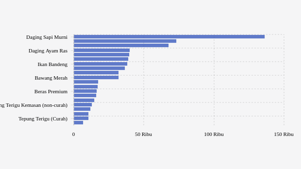 Komoditas bawang merah melonjak paling tinggi Rp390 (1,24%) menjadi Rp31.780 per kg. Adapun harga cabai rawit merah turun paling rendah Rp3.110 (4,4%) menjadi Rp67.570 per kg.