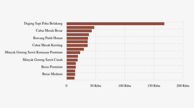Komoditas bawang merah naik paling tinggi Rp193 (0,59%) menjadi Rp32.957 per kg. Adapun harga cabai rawit merah turun paling tajam Rp208 (0,36%) menjadi Rp57.778 per kg.