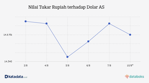 Rupiah dibuka menguat ke level Rp 14.600/US$ pada perdagangan Senin, 10/8 dari perdagangan hari sebelumnya yang sebesar Rp 14.625/US$.