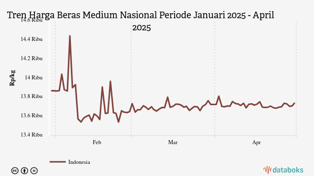 Selama periode Januari 2025 - April 2025, rata-rata harga beras medium terendah Rp13.522 per kg pada Rabu, 29 Januari 2025. Adapun harga tertinggi mencapai Rp13.811 per kg pada Rabu, 2 April 2025.
