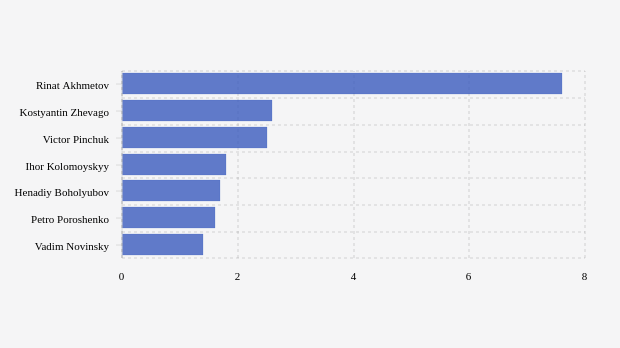 Rinat Akhmetov menempati urutan puncak orang terkaya di Ukraina dengan kekayaan mencapai Rp 109,6 triliun pada 2021. Ia merupakan pengusaha sekaligus oligarki Ukraina yang lahir pada 1966. Akhmetov sebagai pendiri dan Presiden System Capital Management (SCM) hingga pemilik klub sepak bola Ukraina Shakhtar Donetsk.