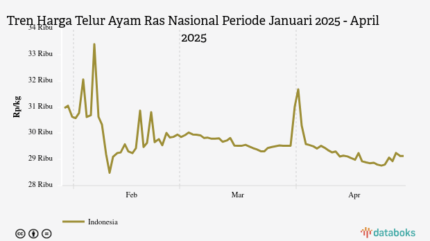 Selama periode Januari 2025 - April 2025, rata-rata harga telur ayam terendah Rp28.764 per kg pada Rabu, 23 April 2025. Adapun harga tertinggi mencapai Rp30.242 per kg pada Rabu, 2 April 2025.