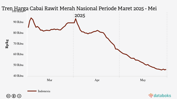 Selama periode Maret 2025 - Mei 2025, rata-rata harga cabai rawit terendah Rp45.812 per kg pada Rabu, 28 Mei 2025. Adapun harga tertinggi mencapai Rp94.193 per kg pada Selasa, 4 Maret 2025.