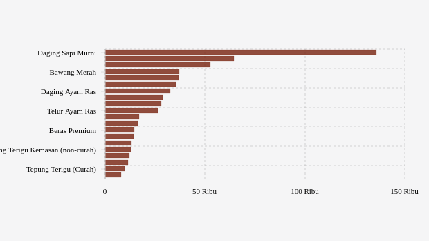 - Daging Sapi Murni: Rp135.830 per kg (naik 1,04%)