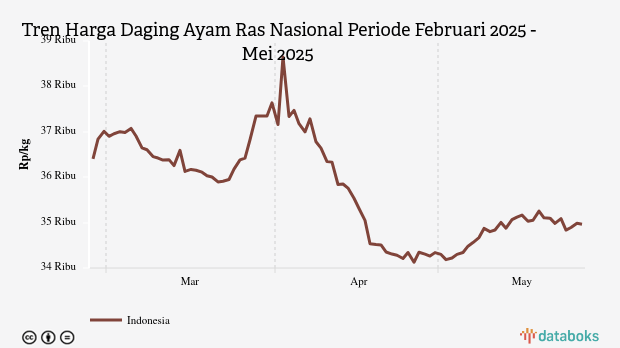 Selama periode Februari 2025 - Mei 2025, rata-rata harga daging ayam terendah Rp34.210 per kg pada Kamis, 24 April 2025. Adapun harga tertinggi mencapai Rp38.537 per kg pada Rabu, 2 April 2025.