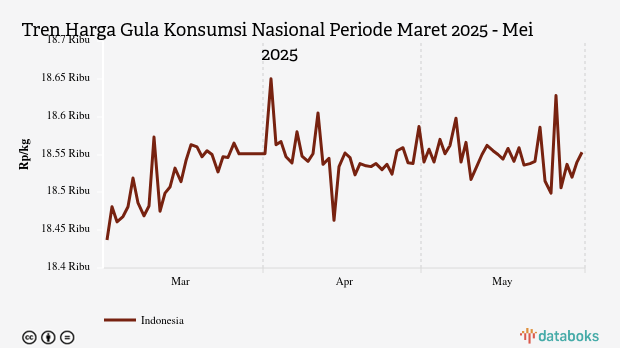 Selama periode Maret 2025 - Mei 2025, rata-rata harga gula terendah Rp18.437 per kg pada Minggu, 2 Maret 2025. Adapun harga tertinggi mencapai Rp18.650 per kg pada Rabu, 2 April 2025.