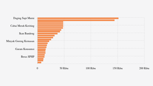 Komoditas bawang merah melonjak paling tinggi Rp437 (1,05%) menjadi Rp42.057 per kg. Adapun harga cabai merah besar turun paling tajam Rp2.500 (4,95%) menjadi Rp48.000 per kg.