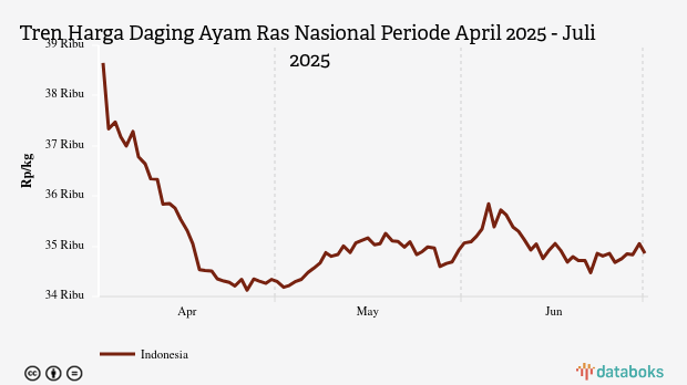 Selama periode April 2025 - Juli 2025, rata-rata harga daging ayam terendah Rp34.210 per kg pada Kamis, 24 April 2025. Adapun harga tertinggi mencapai Rp38.537 per kg pada Rabu, 2 April 2025.