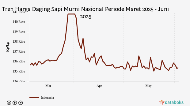 Selama periode Maret 2025 - Juni 2025, rata-rata harga daging sapi terendah Rp135.066 per kg pada Senin, 19 Mei 2025. Adapun harga tertinggi mencapai Rp140.843 per kg pada Jumat, 28 Maret 2025.