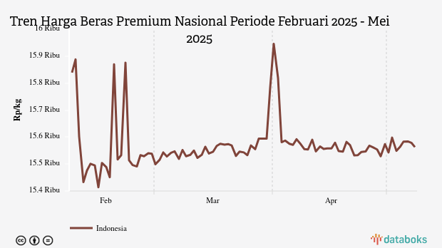 Selama periode Februari 2025 - Mei 2025, rata-rata harga beras premium terendah Rp15.459 per kg pada Senin, 17 Februari 2025. Adapun harga tertinggi mencapai Rp15.786 per kg pada Rabu, 2 April 2025.