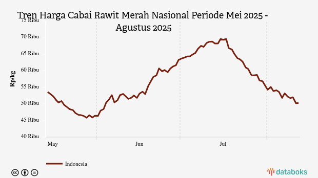 Selama periode Mei 2025 - Agustus 2025, rata-rata harga cabai rawit terendah Rp45.812 per kg pada Rabu, 28 Mei 2025. Adapun harga tertinggi mencapai Rp69.570 per kg pada Kamis, 17 Juli 2025.