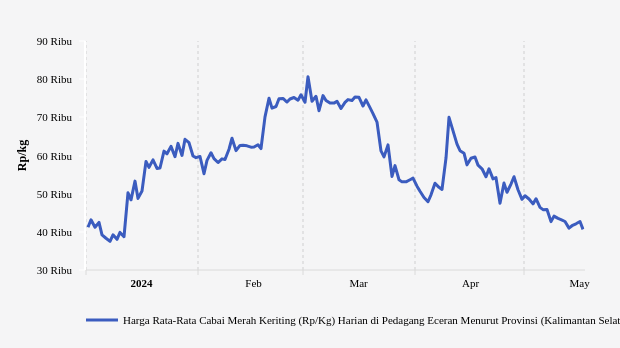 Berdasarkan data harga pangan eceran Badan Pangan Nasional (Bapanas) pada Jumat (17/5/2024) pukul 14.34 WIB, harga cabai merah di Kalimantan Selatan mencapai Rp40.650 per kg.