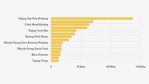 Komoditas telur ayam ras melonjak paling tinggi Rp267 (0,87%) menjadi Rp30.817 per kg. Adapun harga bawang merah turun paling tajam Rp1.700 (3,79%) menjadi Rp43.175 per kg.