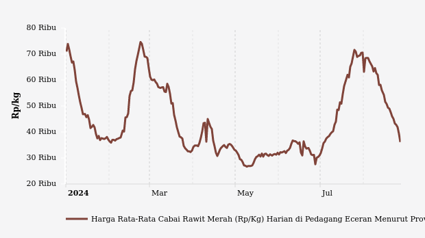 Sepanjang 2024, rata-rata harga cabai rawit terendah Rp26.670 per kg pada Kamis, 9 Mei 2024. Adapun harga tertinggi mencapai Rp74.630 per kg pada Jumat, 23 Februari 2024.