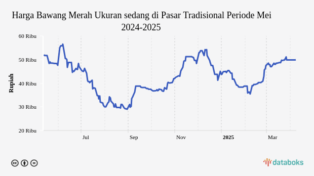 Sedangkan harga bawang merah ukuran sedang harian di pasar tradisional dalam tiga bulan terakhir di Gorontalo terlihat turun 5,57%. Menurut catatan historis harga pangan di panel harga PIHPS, harga bawang merah ukuran sedang harian di pasar tradisional provinsi Gorontalo diperdagangkan di harga Rp52,95 ribu.