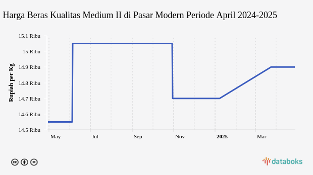 Adapun terhadap harga sebulan terakhir, perkembangan harga beras kualitas medium II harian di pasar modern mengalami kenaikan dari sebelumnya yang tercatat sebesar Rp14,7 ribu per kg.