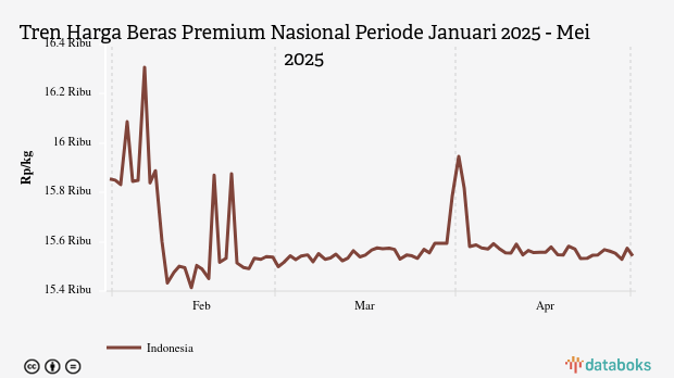 Selama periode Januari 2025 - Mei 2025, rata-rata harga beras premium terendah Rp15.459 per kg pada Senin, 17 Februari 2025. Adapun harga tertinggi mencapai Rp15.786 per kg pada Rabu, 2 April 2025.
