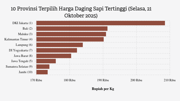 Harga daging sapi harian di pasar modern DKI Jakarta menjadi yang termahal se-Indonesia dengan harga jual Rp.208,55 ribu per kg. Dibandingkan sebulan lalu, harga daging sapi di provinsi ini tidak mengalami perubahan. Harga jual tertinggi yang pernah dicatat di wilayah ini adalah Rp.238,85 ribu per kg.