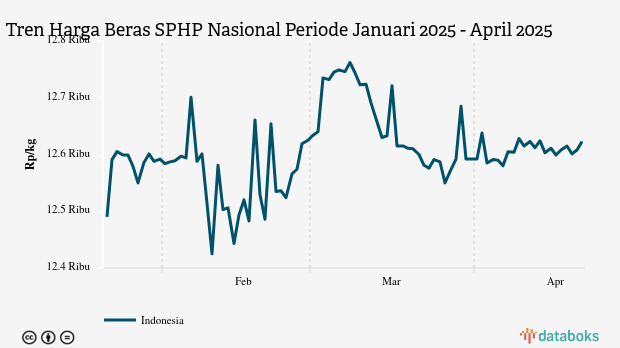 Selama periode Januari 2025 - April 2025, rata-rata harga beras SPHP terendah Rp12.440 per kg pada Senin, 27 Januari 2025. Adapun harga tertinggi mencapai Rp12.762 per kg pada Sabtu, 8 Maret 2025.