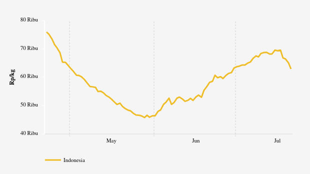 Harga ini turun Rp2.158 (3,32%) dibandingkan dengan kemarin. Dalam sepekan terakhir, harga komoditas ini turun Rp5.311 (7,79%). Adapun dibandingkan dengan 30 hari sebelumnya, naik Rp4.746 (8,16%).
