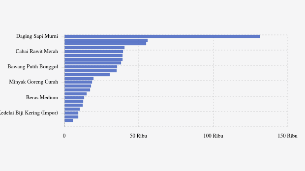 - Daging Sapi Murni: Rp131.071 per kg (turun 0,84%)
