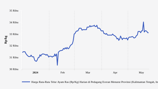 Menurut data harga pangan eceran Badan Pangan Nasional (Bapanas) pada Jumat (24/5/2024) pukul 14.12 WIB, harga telur ayam di Kalimantan Tengah mencapai Rp33.100 per kg.