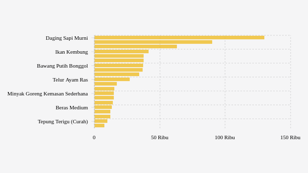 Komoditas cabai rawit merah melonjak paling tinggi Rp10.250 (12,85%) menjadi Rp90.000 per kg. Adapun harga daging sapi murni turun paling rendah Rp4.820 (3,58%) menjadi Rp130.000 per kg.