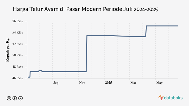 Adapun terhadap harga sebulan terakhir, perkembangan harga telur ayam harian di pasar modern tidak mengalami perubahan dari sebelumnya yang tercatat sebesar Rp55,25 ribu per kg.