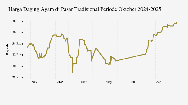 Adapun terhadap harga sebulan terakhir, perkembangan harga daging ayam harian di pasar tradisional mengalami kenaikan dari sebelumnya yang tercatat sebesar Rp36,1 ribu .