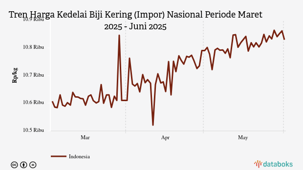 Selama periode Maret 2025 - Juni 2025, rata-rata harga kedelai biji kering impor terendah Rp10.562 per kg pada Minggu, 2 Maret 2025. Adapun harga tertinggi mencapai Rp10.877 per kg pada Minggu, 25 Mei 2025.