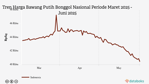 Selama periode Maret 2025 - Juni 2025, rata-rata harga bawang putih terendah Rp40.443 per kg pada Minggu, 1 Juni 2025. Adapun harga tertinggi mencapai Rp45.389 per kg pada Rabu, 2 April 2025.