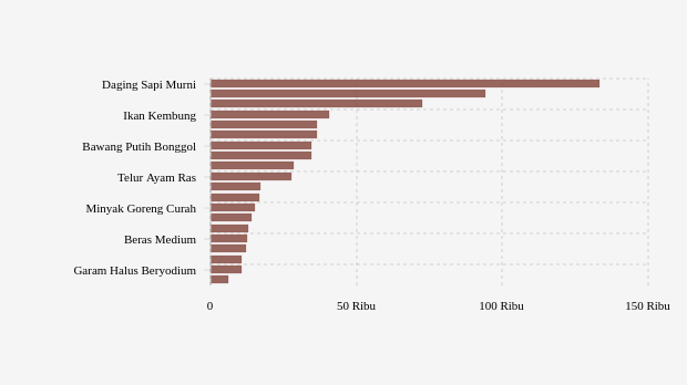 - Daging Sapi Murni: Rp133.230 per kg (naik Rp620)