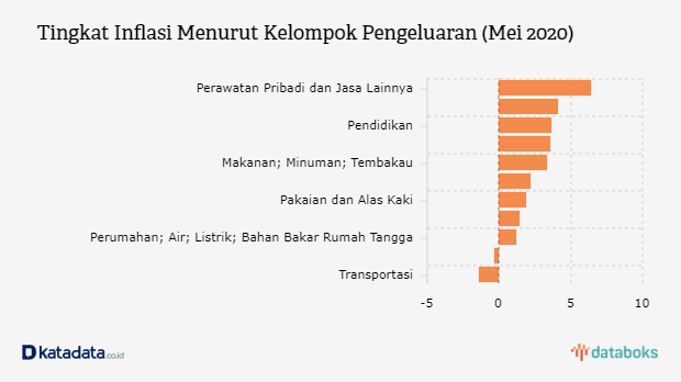 Adapun kelompok tertinggi yang mengalami deflasi terdapat pada transportasi sebesar 1,37% (yoy). Informasi, komunikasi, dan jasa keuangan menyumbangkan sebesar 0,29% (yoy). (Baca: Inflasi Idul Fitri 2020 Lebih Rendah dari Tahun Lalu)