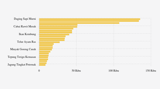 Komoditas tepung terigu kemasan melonjak paling tinggi Rp195 (1,67%) menjadi Rp11.895 per kg. Adapun harga bawang merah turun paling dalam Rp1.604 (3,51%) menjadi Rp44.048 per kg.