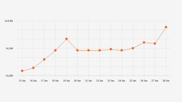 Nilai tukar rupiah di pasar spot pagi hari ini hingga pukul 07.15 WIB diperdagangkan Rp 14.386 per dolar AS pada Jumat, 28 Januari 2022. Nilai tukar ini melemah 0,25% dibanding penutupan hari sebelumnya yang diperdagangkan Rp 14.350 per dolar AS. Perdagangan hari ini nilai tukar rupiah diperkirakan bergerak pada rentang 14352,5 - 14392,5.