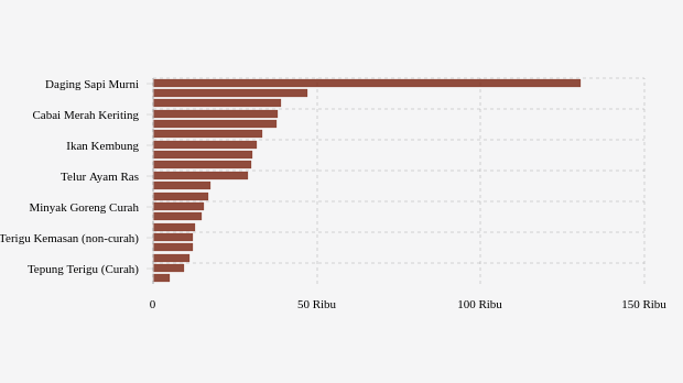 - Daging Sapi Murni: Rp130.620 per kg (naik 0,03%)