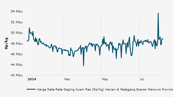 Sepanjang 2024, rata-rata harga daging ayam terendah Rp43.800 per kg pada Selasa, 2 April 2024. Adapun harga tertinggi mencapai Rp50.910 per kg pada Jumat, 5 Januari 2024.