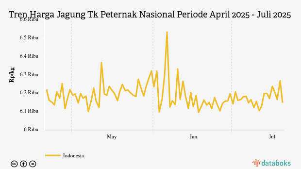 Selama periode April 2025 - Juli 2025, rata-rata harga jagung terendah Rp6.097 per kg pada Rabu, 18 Juni 2025. Adapun harga tertinggi mencapai Rp6.533 per kg pada Jumat, 6 Juni 2025.